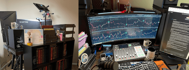 This is where the experiments are run. 35” curved next to a 27” vertical. I sometimes split the big screen into two windows. RodeCaster Pro with a Rode PodMic. I occasionally mount my Canon EOS 50 with the big lens, but even with another Rode shotgun mic, its mostly benched because two Logitech cams just work great! KRK Rokit 5's on 20” stands producing smooth sound that can rock the house on command. And yes, that’s a signed Indiana Jones world map on the wall. You can't really see it using this new image, but George Lucas made a fan out of me early.